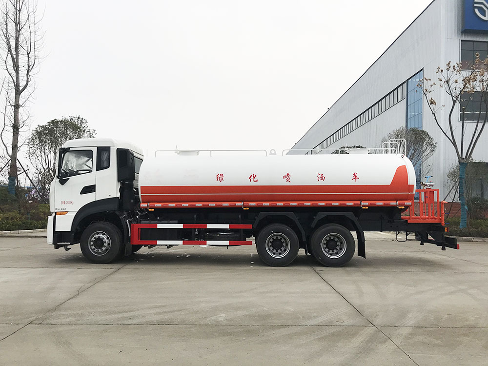 • 【性能簡介】前沖(噴)后灑,帶側噴花灑,罐體后帶工作平臺。平臺上安裝綠化灑水高炮,炮可全方位360°旋轉,炮噴射形狀可連續調成直沖狀、大雨、中雨、小雨、毛毛雨,平臺邊安裝灑水砣和低位花灑,罐體右上側安裝高位花灑。配備自吸自排優質灑水泵,吸程≥7m,灑水寬度15-21m,灑水炮射程20-35m,帶消防接口、濾網、自流閥,罐體管道和防護網采用鍍鋅材料,罐體采用碳鋼板,內有隔板,罐體機器人自動焊接。采用底盤自帶原裝取力器,上裝面漆為烤漆。帶灑水警示音樂和小警燈,帶水位計。緊急時可抗旱和消防運水。
